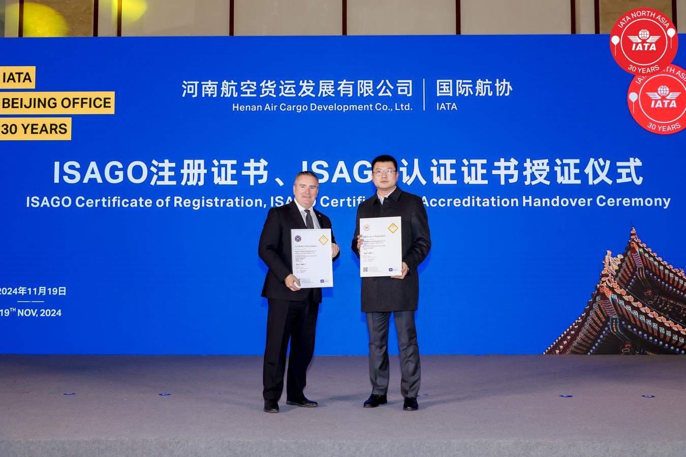 11月19日,河南航空货运发展有限公司在顺利通过国际航空运输协会地面运营安全审计(简称“ISAGO”)后,获颁ISAGO注册证书、ISAGO认证证书,意味着郑州机场货运地面服务保障得到了国际权威机构认可,达到了国际领先水平,郑州机场在全球航空货运市场的竞争力进一步提升。